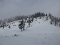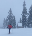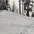 Cilj včerajšnjega pohoda na smučeh in krpljah iz doline Bele je bila Perkova kočica. Stoji na sedlu pod Pavličevimi stenami, ki ga domačini imenujejo Legar, in je na slovenski strani le kakšnih 15 m od državne meje z Avstrijo. Naprej od cestnega odcepa Legar/Lesnikovo sedlo je bila hoja naporna, ker sva si z Jožo utirala pot po vse globljem snegu. Na Legarju se je palica udrla za pol metra vse do tal. Do kočice sva hodila v megli, ob odhodu pa se je razkrajala in vidljivost je bila vse boljša, le visoke planine so se dolgo časa skrivale. Na delih ceste brez kolesnic se je dalo vijugati, v spodnjem delu poti pa sem si med njimi večkrat pomagal s pluženjem.