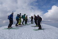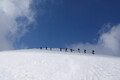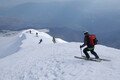 Tome z mladino hitro navije tempo. Da ujamem ritem – in hkrati vsaj delček veličine pokrajine skozi objektiv – se moram kar pošteno potruditi. Vzpon sprva poteka zložno, skoraj meditativno, nato pa proti vrhu pokrajina pokaže kakšne zob: široko pobočje se zoži v greben, kjer veter in sneg naredita svoje. A razmere nam gredo na roko – sneg je ravno prav omehčan, da lahko na smučeh stopimo vse do vrha, ki mu zmanjkata zgolj dva metra do višine 2500 metrov.