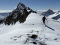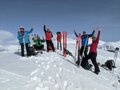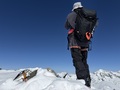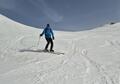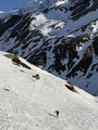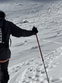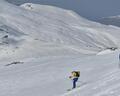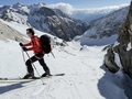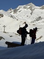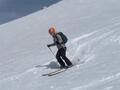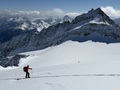 Prvih 500 višincev od P je snega samo...no, ni ga. Od 1900 do Essener-Rostocker hütte 2180 gre potem s kratkimi peš vložki na smučeh. Nad 2500 je včeraj zapadlo od 5 do 10 cm novega. To je bilo dovolj za prijetno smuko na ledeniku in tudi na SZ pobočjih nižje. Na skoku z ledenika na vršni greben je že 2m gole skale. Na dol sva si pomagala z vrvjo. Po grebenu do vrha dereze niso bile potrebne.