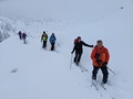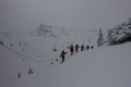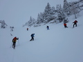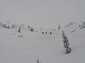V torek se zbudimo na zasneženi Komni. Že pri Domu je 40 cm snega in še sneži. Prav zelo se nam ne mudi. Malo po deseti se le spravimo ven. Zunaj ni nobene sledi. Med sneženjem in v megli gremo do Planine Na Kraju. Ker se nič ne vidi naredimo kakšno zanko. Od planine se vzpnemo še na Turška vratca in na najbližji vrh nad vratci. Kljub temu, da se ne vidi nič, je smučanje po pršiču pravi užitek. Nazaj grede "izravnamo" špuro do Doma na Komni. Popoldne se nam namerava pridružiti še Boris. Po nekaj pivih ugotovimo, da bo brez smuči težko prišel od Savice. In mu gremo pomagat. Odsmučamo, bolj po poti, da se gor grede ne bomo preveč namučili. No kakšen ovinek za uživaško vijuganje le presekamo. Na dobrih 1000m se srečamo z Borisom in se skupaj vrnemo na Komno.