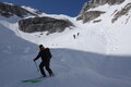 Ocenimo, da bi nam vzpon na Kanjavec vzel preveč časa, zato se soglasno odločimo za spust proti planini Jezerce, medtem ko Mirko zavije proti Lazovškemu prevalu. Smučamo po raznolikem snegu in moramo bolj kot običajno iskati prehode med vrtačami – snega je vendarle manj, kot smo ga vajeni v teh koncih. V najstrmejšem delu grape malo plazi, a nič kritičnega.