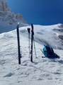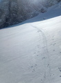 Takoj iz parkinga na smučke, no dobr ene dvesto metrov je vseeno treba peš, da prideš na niti ne prehudo ledeno cesto. Nisem bi zgoden, pozen pa tudi ne-mal čez deveto. Veter preteklih dni se naj bil tekom dneva umiril in res, ga skoraj ni bilo, razen na vrhu sedla. Dva italijana pred menoj tacata ravno po špuri. Neverjetno res. Bi jima kaj rekel, vendar, ko ju dohitim, vidim zaljubljen par. Brez veze, itak sta z mislimi na pol drugje. No nekje sredi melišča se tudi jaz odločim, za pešaka in da bom dal smučke na hrbet. Poln kufr mam odrsavanja, zato do izravnave pod ozebnikom nosim. Eden pred menoj brez težav na dilcah, meni pa ne ratuje. Ne vem, nekaj glede hoje mi ne špila. Kakrkoli, kmalu sem na vrhu sedla in kmalu me tudi ni več. Piha. Smuka pa vse živo, od klože, napihanca, zastrugov, betona, pred gmajno skoraj čofta, v gozdu pred kočo lepa steza, poglihana u nulo, ni da ni. Lep dan je bil. Aja, sem poskusil še na velikanko, pa me je mojstr očitno zadolžen za njo vljudno opozoril, da me ne bo spustil po puklu. Lep pozdrav, Samo