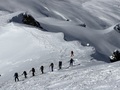 Prejšnji teden smo obiskali osrednji del NP Vanoise v Franciji. Za ta spomlad smo si zastavili dve možnosti, ki sta dovolj narazen da vreme in snežne razmere niso podobne (beri: enako neugodne ko pride čas za turo). Prva varijanta je bila prečenja Albulških Alp (severni del Graubuendena) druga pa obisk osrednjega dela NP Vanoise, ki smo ga planirali že leta 2019. V začetku marca so se je plazovna situacija v Graubuendenu izboljšala in smo se odločili da gremo tja. Vreme je okoli 10. 3. kazalo dobro, potem je prišlo sneženje, ki je od 13. do 14. 3 pustilo 60 vm novega snega na območju Julirepassa in je nevarnost plazov postala previsoka; obenem je v Vanoise padlo do 30 cm snega, napovedano je bilo hitro upadanje lavinske nevarnosti. Iskazalo se je in da bo le nakaj dni lepega vremena in da če želimo na turo to mora biti med 16. in 21. 3. Prvotno načrtovano turo v Vanoise od 7 dni smo skrajšali na 6 (odpovedali smoe se vzponu na Grand Casse), ponovno smo rezervirali koče, edino ni bilo prostora v koča Dent Parache ali Fond du Aussois (prav bi prišle za aklimatizacijo), ki so nad smučičem Aussois. V ponedeljek 16. 3. smo se skozi Padsko nižino zapeljali do Torina in potem proti jugu do Modanea skozi tunel Frejus. Prespali smo v apartmaju v vasi Avrieux pod Aussoisom in se naslednje jutro z sedežnicami Armoise in Grand jeu odpeljali na 2600 m in prečkali okoli JZ rebra Dent Parache. Sledil je vzpon na Col de Labby (3320 m) in spust po lednikih Genepy in do Mahure do jezera Arpont (z enim vmesnim vzponom). Sneg he bil napihana skorja, ki ne drži. Kratki vzpon (20 m nV, ampak 500 m v daljavo) na prelom nad kočo Arpont in spust po žlebu do nje (spet skorja, zadnjih 100 m v odjenjani srenec).